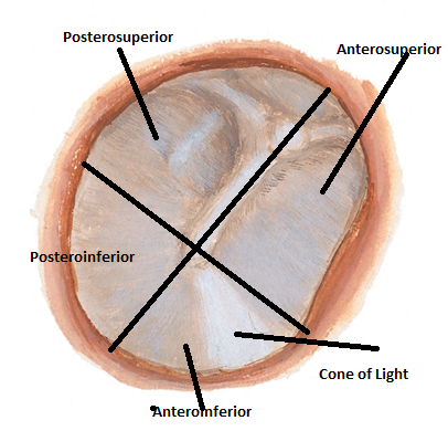 Anterosuperior, anteroinferior (shows very bright on examination, ergo refered to as cone of light), posteroinferior, posterosuperior