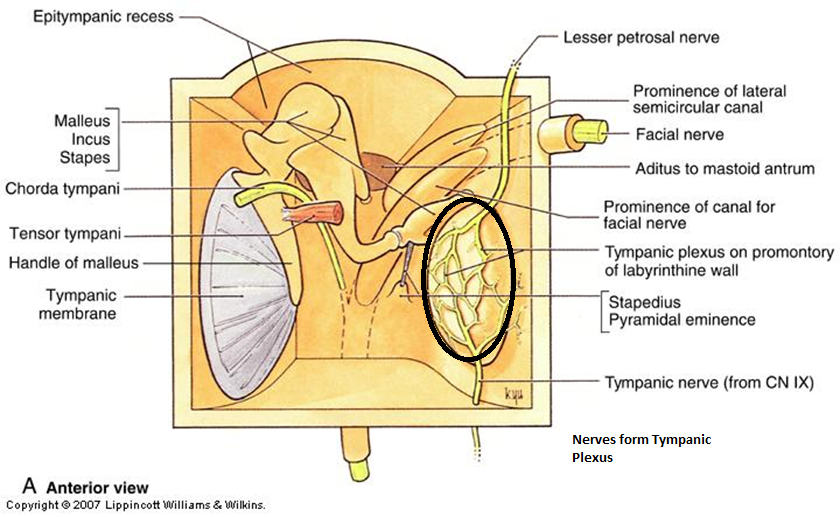 Tympanic nerve (branch of CN IX) divides into branches which form the tympanic plexus. Found in the medial wall of the tympanic cavity. Provides innervation to the mucosa of the middle ear, along with autonomic parasympathetic fibers that eventually innervate parotid (lesser petrosal)