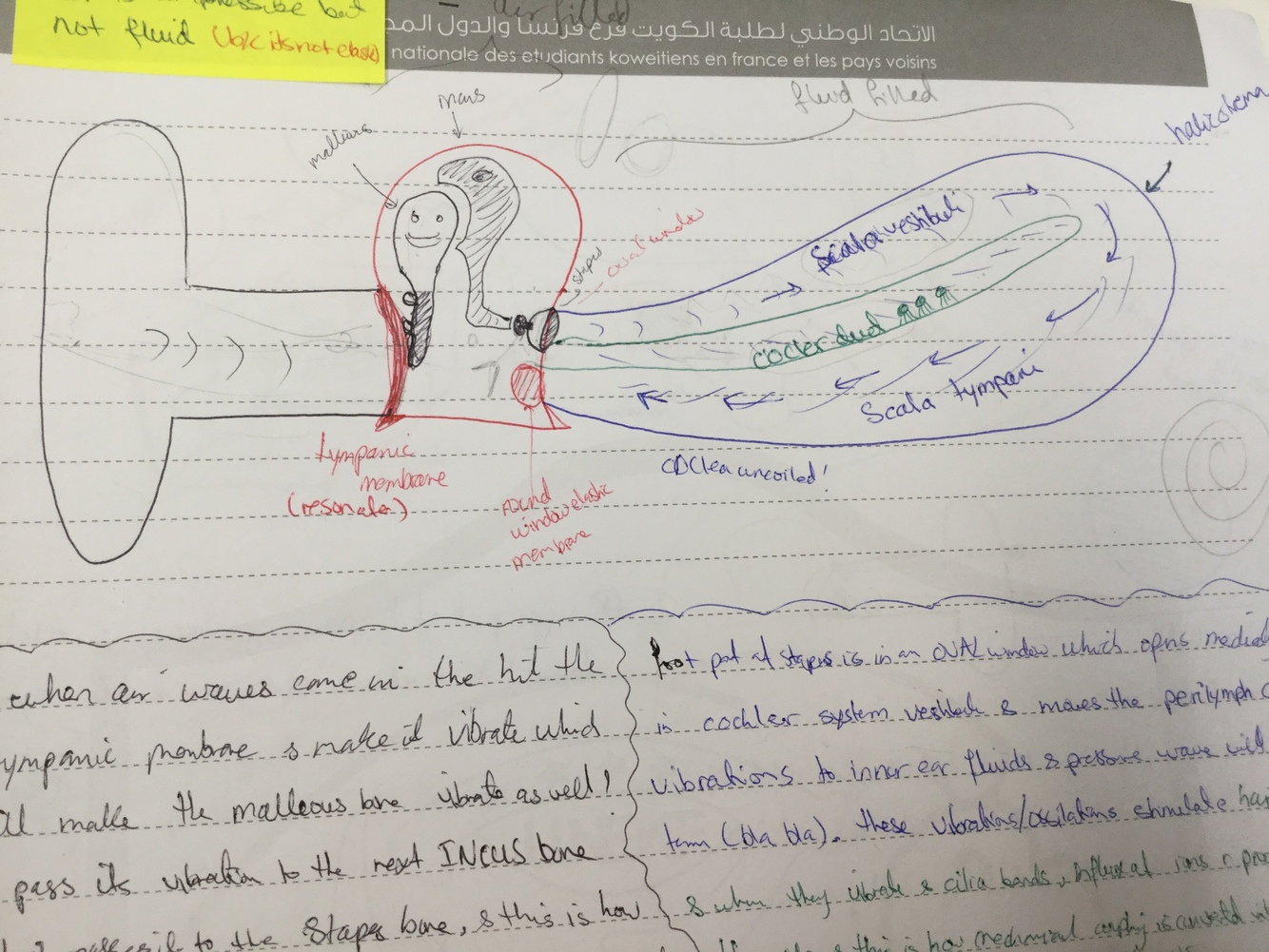 The handle of the malleus is attached to the tympanic membrane while its body articulates with that of the incus. The incus then articulates with the stapes then opens at oval window