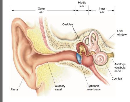 outer ear cartilaginous, made out of pinna (auricle) and auditory canal (acoustinc meatus), ending at tympanic membrane middle ear between tympanic membrane and oval window, with ossicles (malleus, incus+ staples) inner ear is cochlea and vestibular apparatus