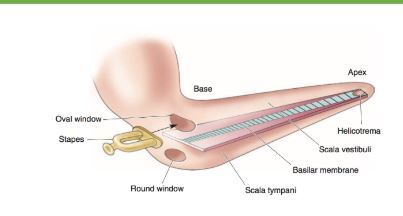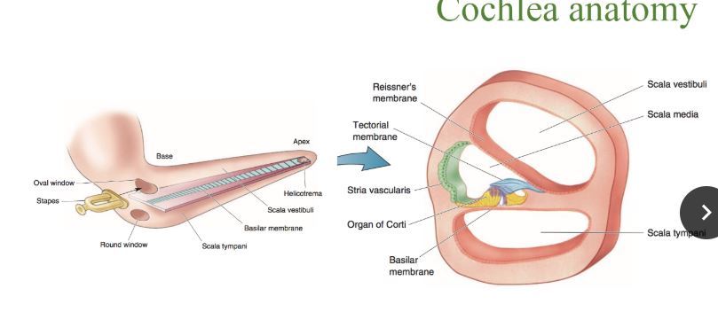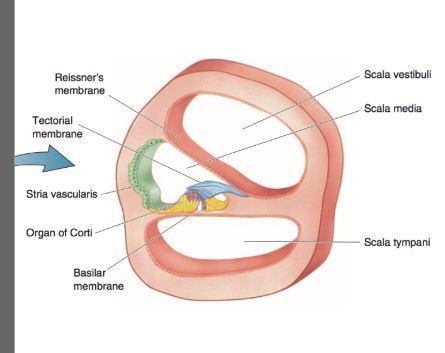 once sound hits oval window, they go to SCALA VESTIBULI and then SCALA TYMPANI- it travels up reissners/vestibylar membrane, creating pressure wave in scala media- then goes across basial membrane and joins pressure wave in scala tympani