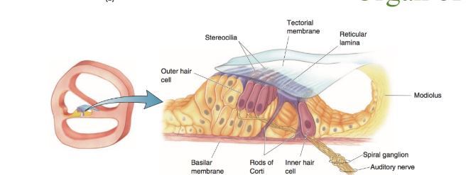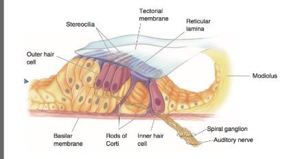 bone structure where spiral ganglia from CN8 are present- base of hair cells at basilar membrane send impulses to axons of CN8 - impulses travel to spiral ganglia in modiolus, then to vestibulocochlear nerve, then brainstem