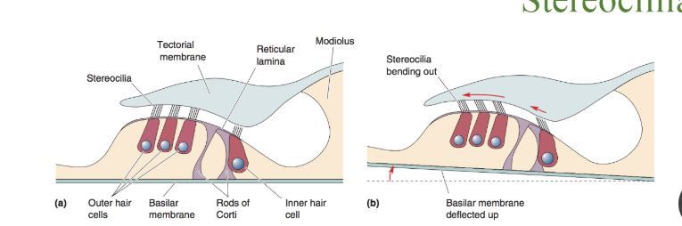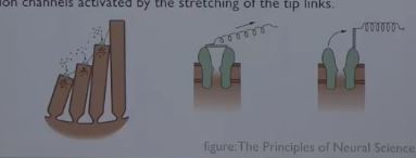 their movement causes opening of K+ channels- in upwards phase, movement causes basilar membrane to go up and hair cells move away from modulus= K+ channel open= Ca2+ open= glutamate release= A.P in hair cell, then spiral ganglion