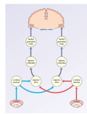 cochlear nerve (part of CN8) takes impulses from cochlea to cochlear nucleus, then to superior olive AND the OTHER SUPERIOR OLIVE- means that info from one ear goes to both pathways, so hearing loss on one side can only be due to cochlear nerve or ear problem info then sent to inferior colliculus, then medial geniculate body in thalamus, then auditory cortex in temporal lobe
