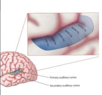 primary auditory cortex has different regions to for different frequencies- secondary auditory cortex helps respond to more COMPLEX sound patterns