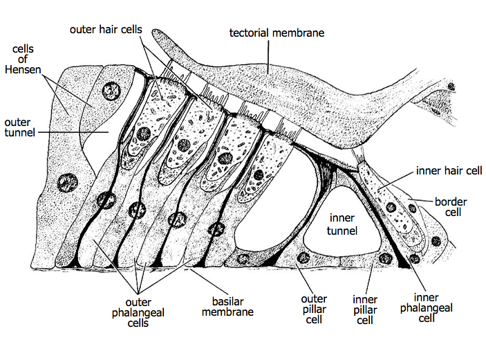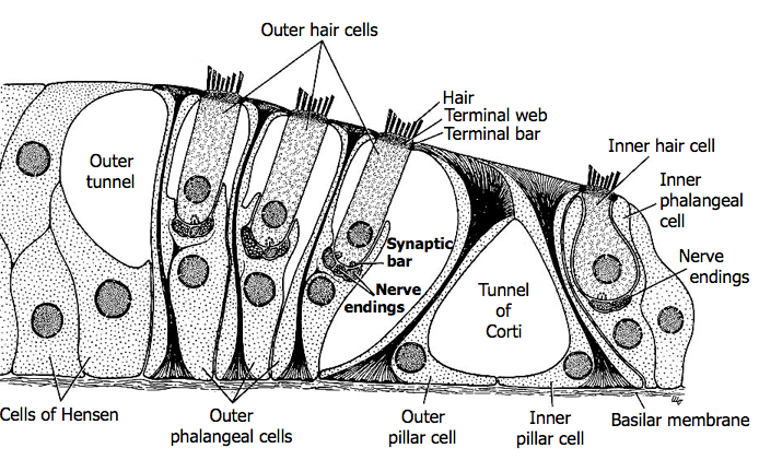 Write down the general idea of the cellular amke-up of the organ of corti along with supporting cells.