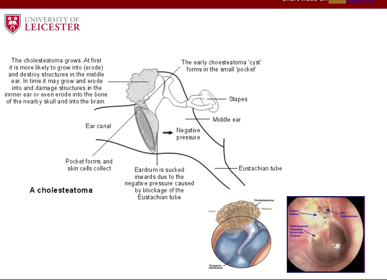 outmost layer of skin usually is sloughed off, but when the skin finds itself in the middle ear, it has no where to shed! so it’ll grow like a “tumour’ and the bone around that area remodels!