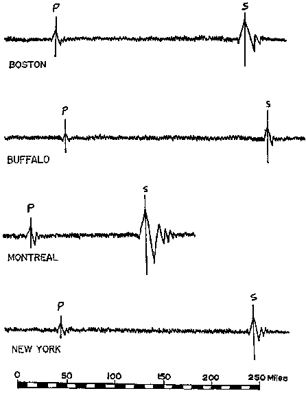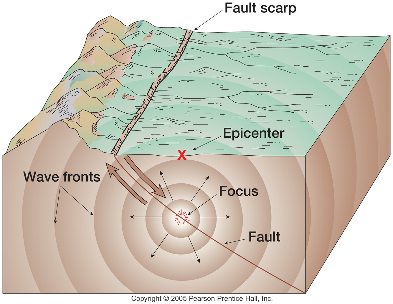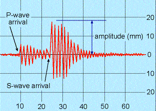 Primary wave. Fastest waves. Start from focus. Move through solids and liquids.