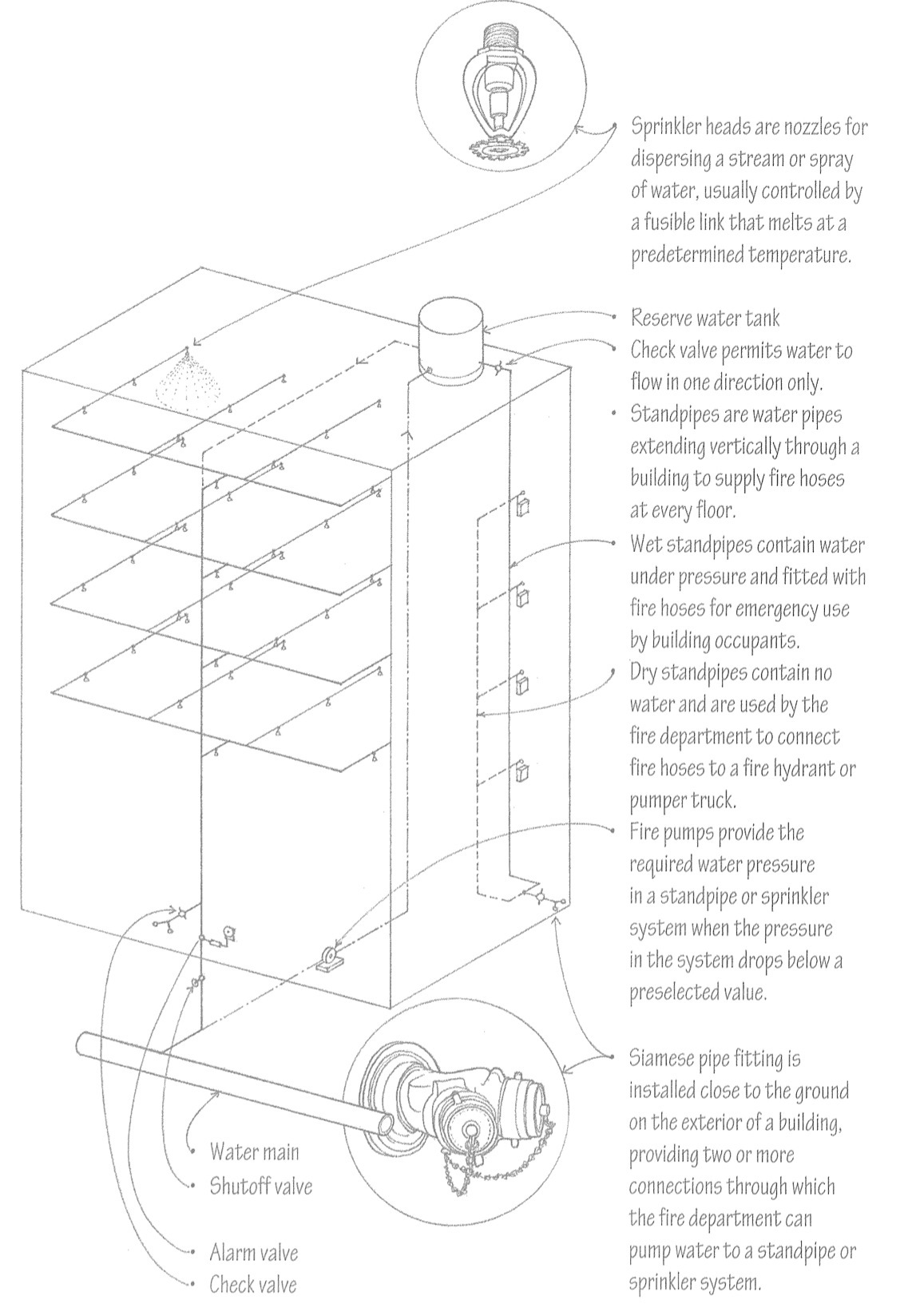 Conduites verticales qui alimentent les boyaux d’incendie à chaque étage.