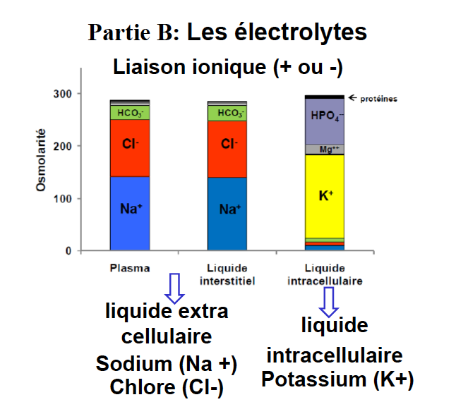 Quelle est la composition des électrolytes dans le liquide extracellulaire (plasma, liquide intertitiel) et liquide intracellulaire?