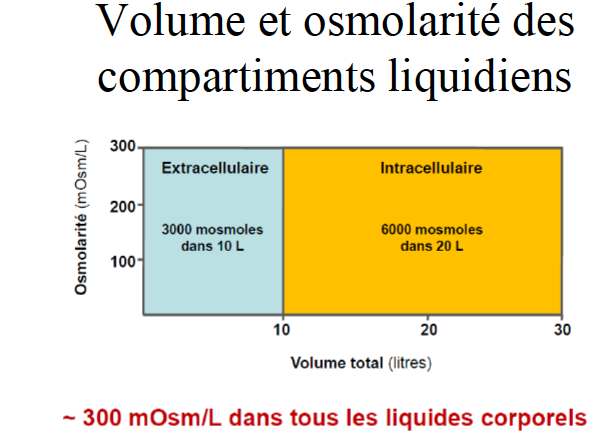 l’équilibre osmotique requiert qu’il y ait le même nombre de particules dans un Litre de liquide extracellulaire que dans un liquide intracellulaire