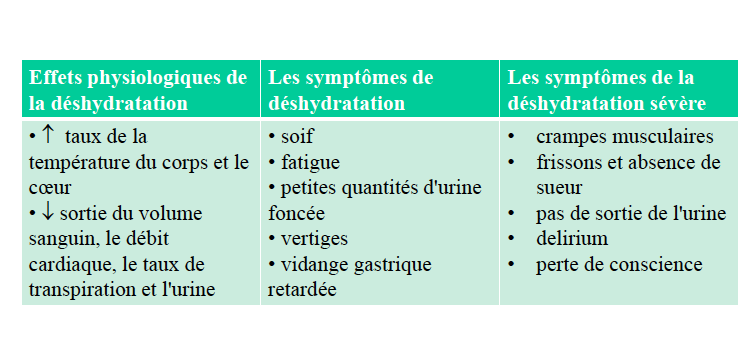 Quels sont les effets physiologiques et les symptomes de la déshydratation et les symptomes de la déshydratation sévère?