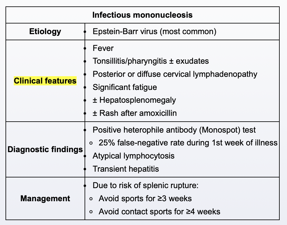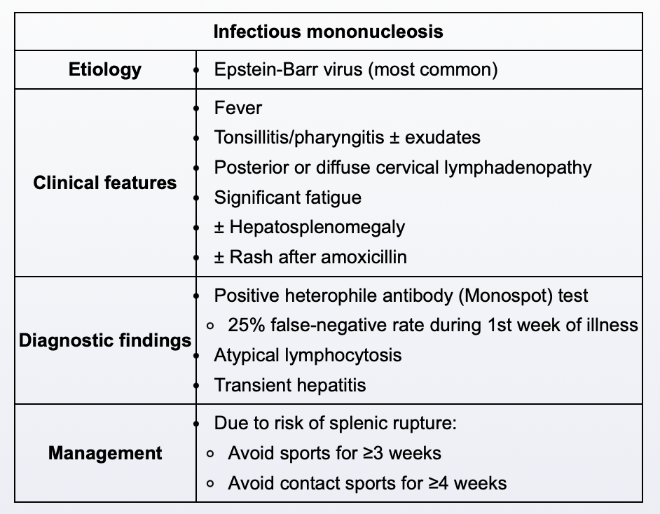Infectious mononucleosis (IM) is a viral syndrome most commonly due to Epstein-Barr virus, with manifestations that commonly include fever, fatigue, exudative pharyngitis, lymphadenopathy, and hepatosplenomegaly. Liver function test results may be mildly elevated. Patients with IM may develop an erythematous exanthematous rash, which is usually maculopapular, urticarial, or morbilliform and most often erupts after inappropriate administration of amoxicillin or ampicillin. The etiology of this well-known phenomenon is unclear, although it may be an immune-mediated response to circulating antibodies against penicillin derivatives. The rash is not considered a true antibiotic allergy and will resolve spontaneously over time with observation and supportive care.