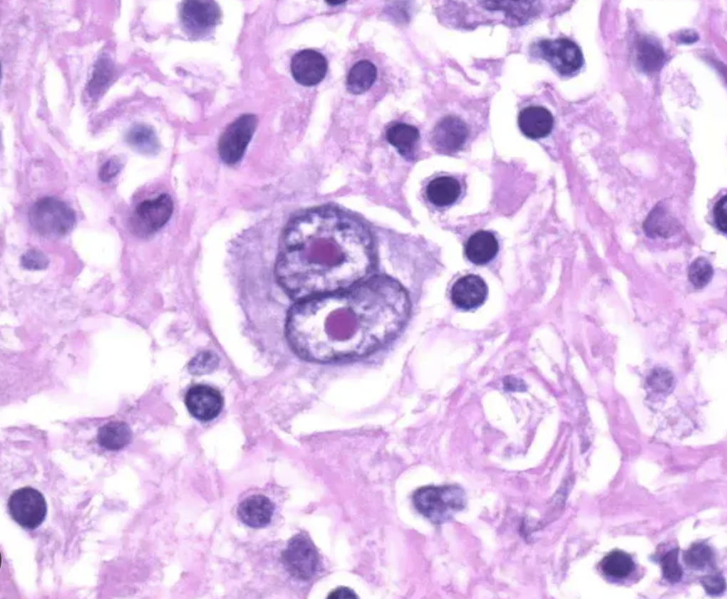 Reed-Sternberg cells (large abnormal B cells with owl-eye nuclei).