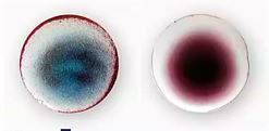 The left one is positive – red agglutination on a blue backround show presence of infectious mononucleosis heterphile antibodies.