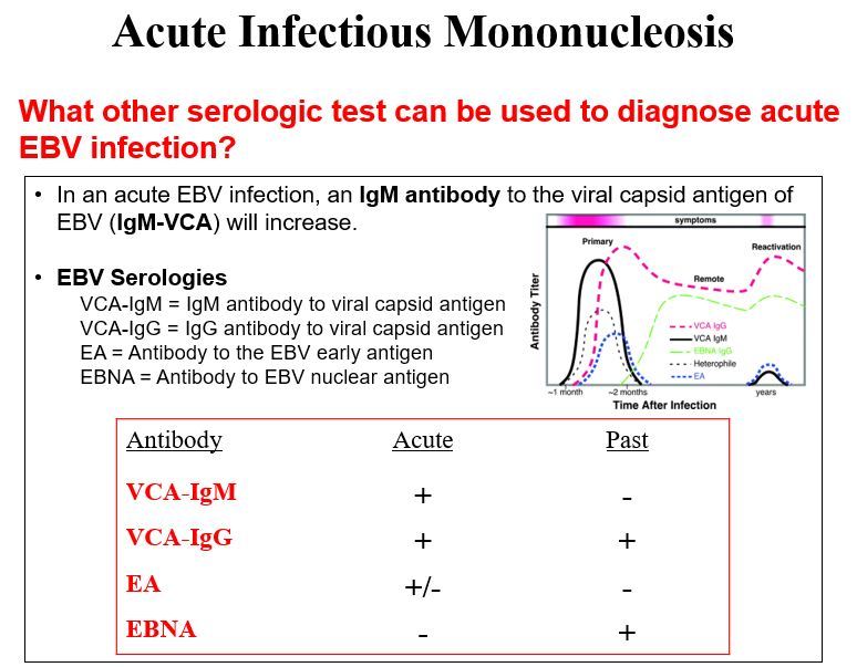 In acute phase infectious mononucleosis, you can do an a IgM antibody test to measure the presence of viral capdi antigens of EBV (IgM-VCA).