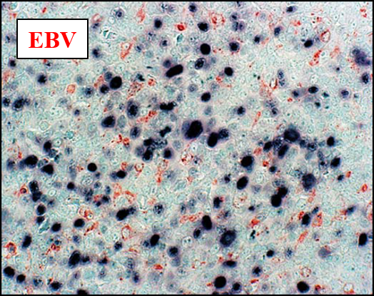 EBV induces a proliferation of LYMPHOCYTES in lymphoid tissue. When EBV infects these, they become transformed LYMPHOCYTES. They become large atypical cells with prominant NUCLEOLI resembling malignant LYMPHOCYTES.