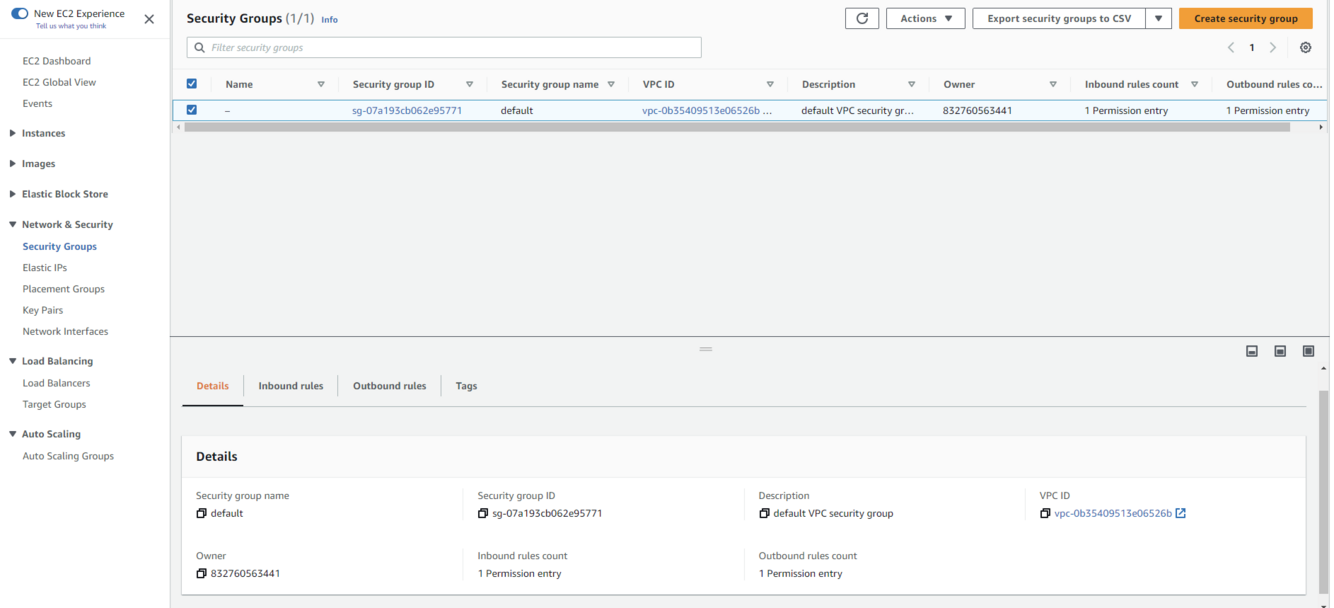 What is the default configuration for inbound and outbound traffic in an AWS security group?