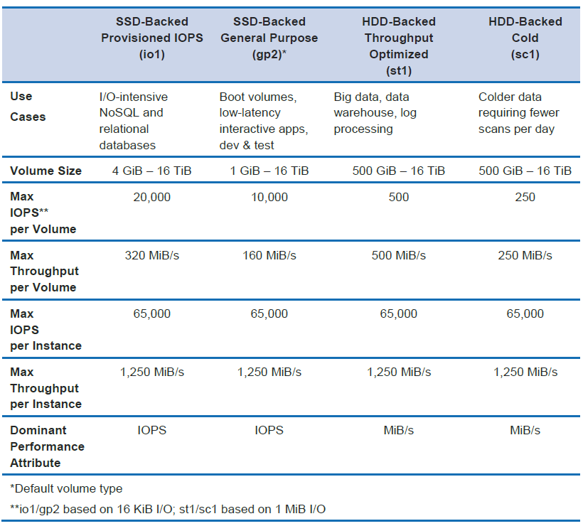 EBS Volumes: Network attached, persistent storage. The root device for an instance launched from the AMI is an Amazon EBS volume created from an Amazon EBS snapshot