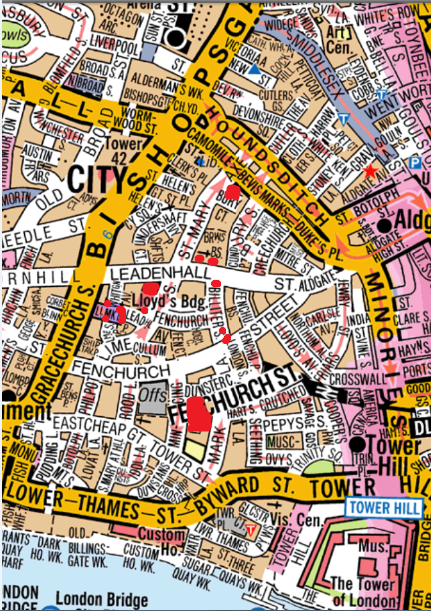 Arrival Details: Fenchurch st, North into Lime st, R Fenchurch Ave, Billiter square LorR