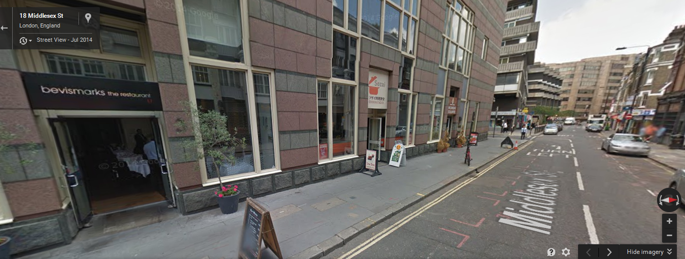 Arrival Details: Fenchurch st, North into Lime st, Left into Leadenhall place, Leadenhall market facing