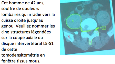Un patient de 30 ans consulte pour des douleurs lombaire en barre irradiant jusqu’à la partie distale de la jambe droite. A l’IRM, on observe une hernie L4-L5 postérolatérale gauche.