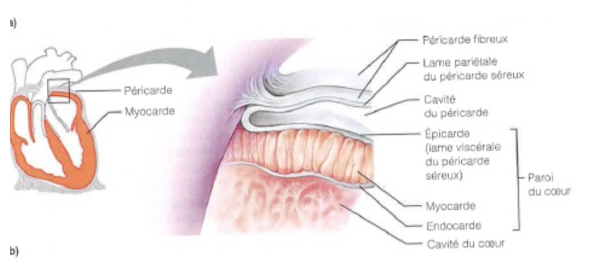 Le péricarde fibreux est lui-même formé de deux couches : une pariétale et une viscérale. La couche pariétale tapisse la face interne du péricarde séreux et se raccroche aux artères émergentes du cœur. La couche viscérale, elle est la première véritable couche du cœur. On la nomme épicarde.