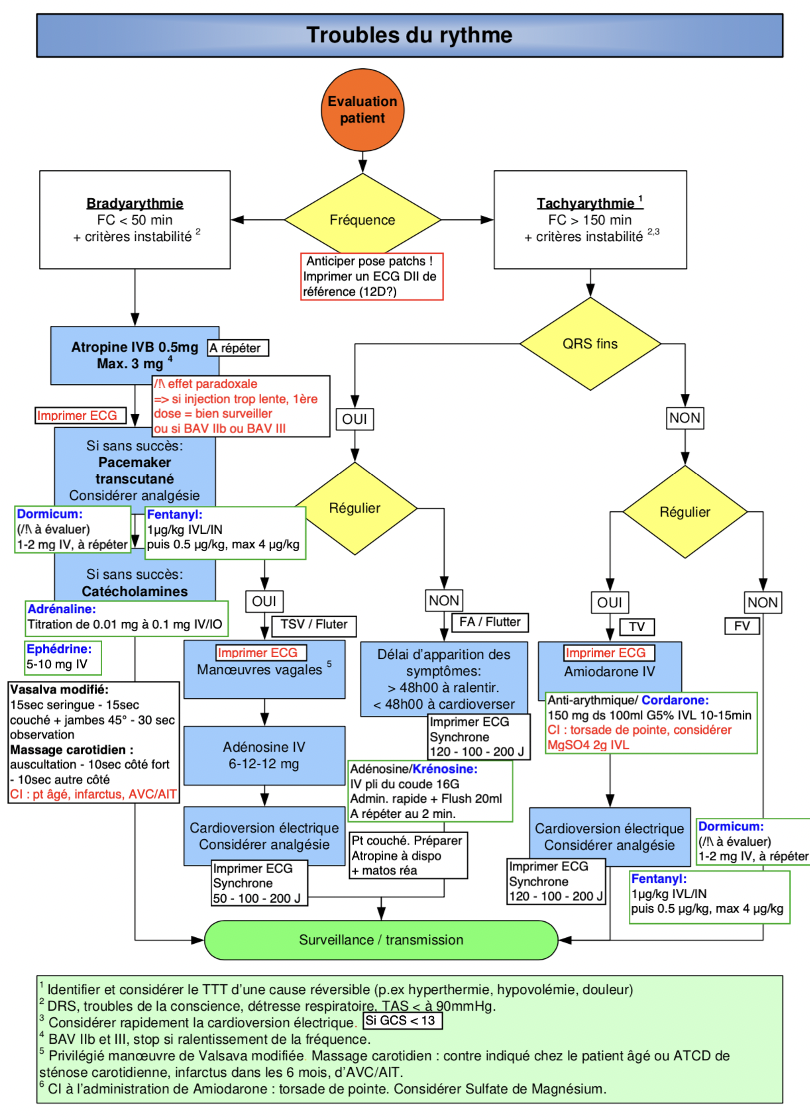 Anticipation : Il est important de poser les patchs précocement afin d’anticiper la défibrillation, de préparer la place de travail et d’avoir suffisamment de place pour anticiper le MCE, de préparer la gestion des voies aériennes avec le matériel d’intubation et de ventilation, de préparer la trousse de médication et éventuellement ADRENALINE (1mg/ml) + AMIODARONE (300mg puis 150mg), de préparer l’analgésie et d’acheminer le patient vers le bon plateau technique.