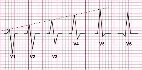 Deep S waves in early chest leads. Tall R waves in late chest leads. T wave inversions may be apparent