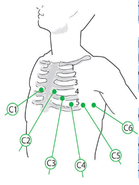 a)Place the C1 adhesive in the fourth intercostal space at the right sternal border. (Palpate down from the sternal angle.)