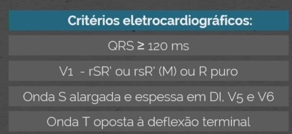 QRS largo (> 120 ms) com predomínio de onda R em V1.
