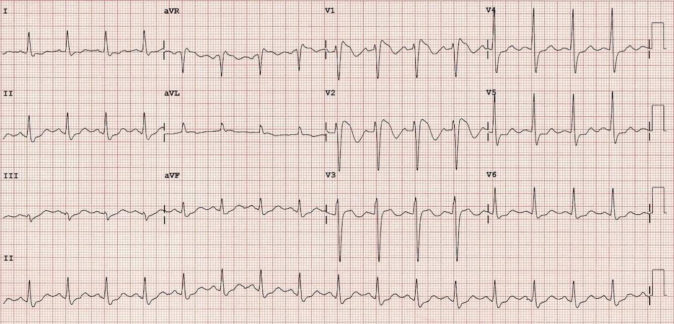 Deeply inverted or biphasic T waves in leads V2-V3