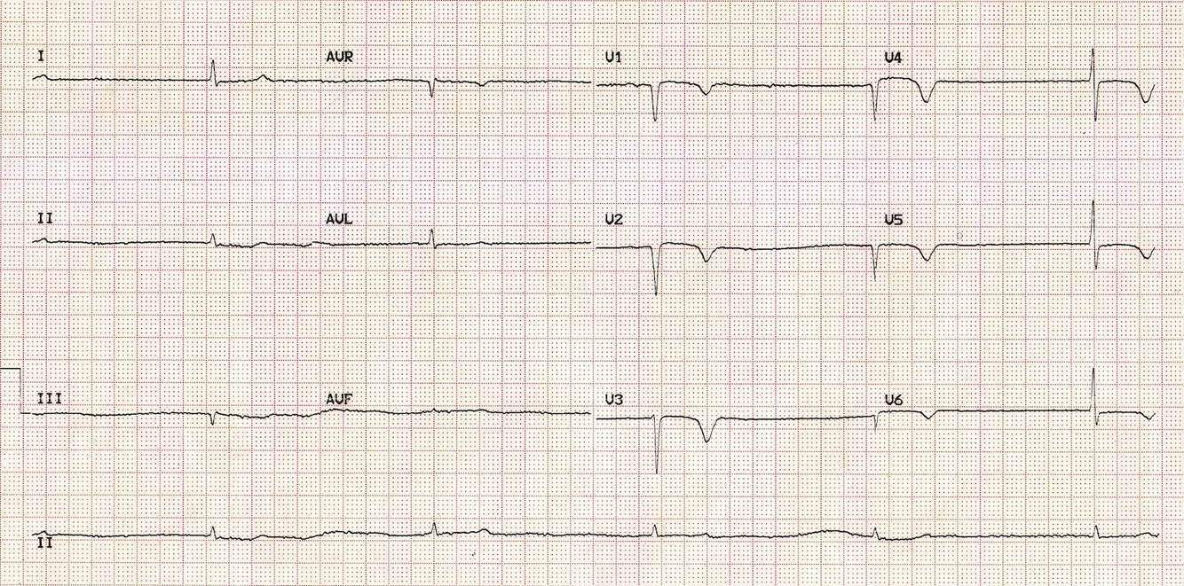 Flattened, inverted, or biphasic T waves inc TU wave.