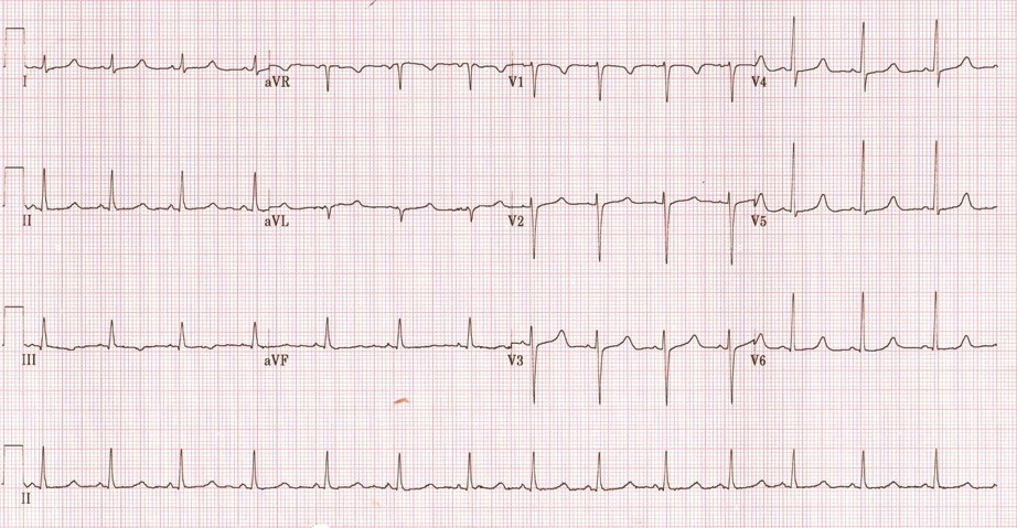 Widespread concave ST elevation and PR depression throughout most of the limb leads (I, II, III, aVL, aVF) and precordial leads (V2-6).