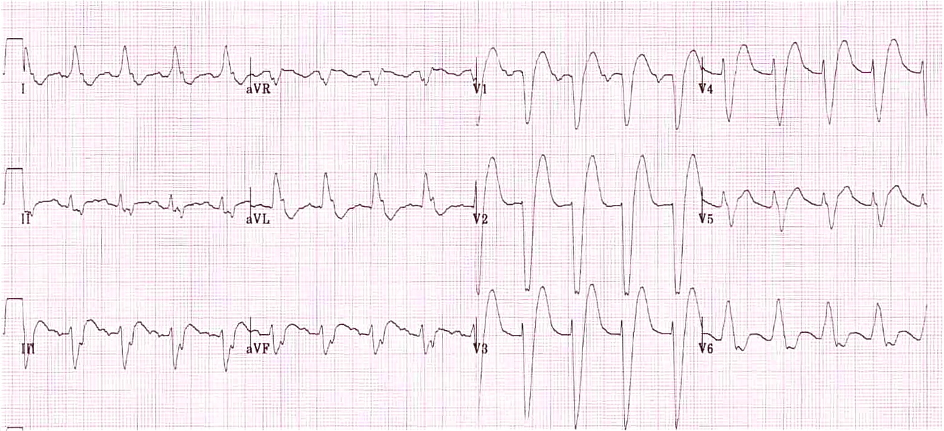 Discordant ST depression and T wave inversion (opposite direction to QRS dominance)