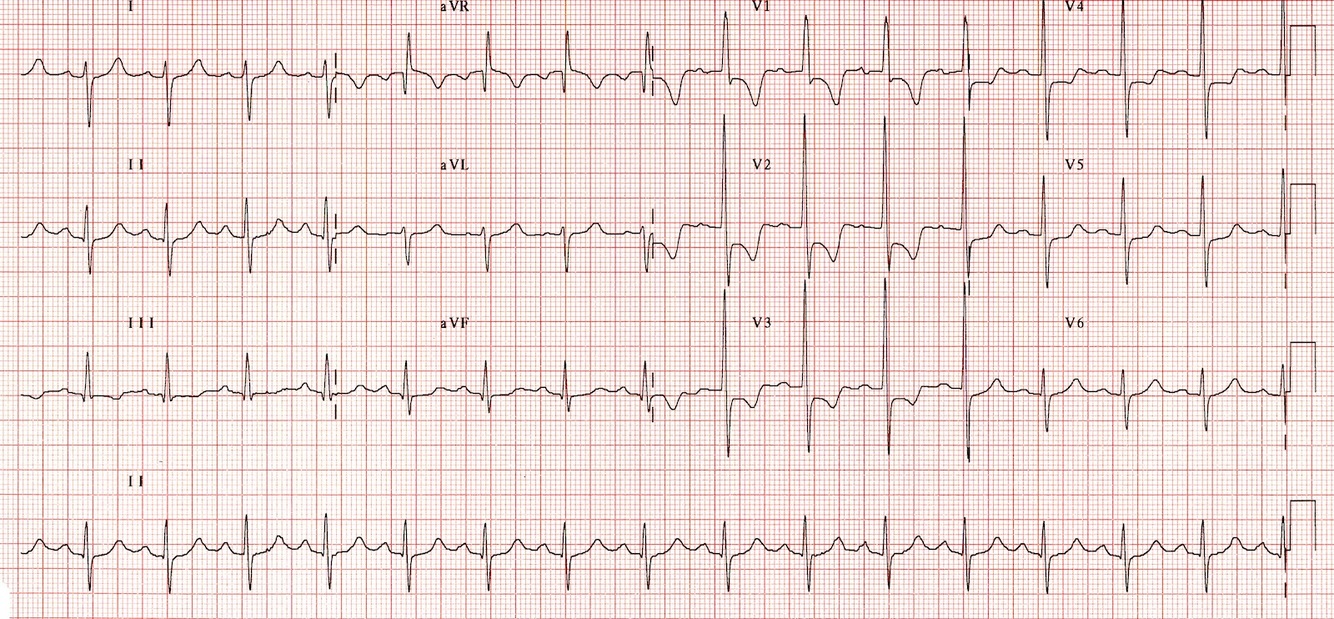 LV strain pattern on lateral leads esp V6 = ST depression + T wave inversion. without coresponding ST elevation in inferior leads