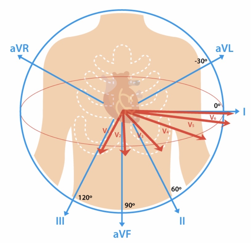 A 12-lead ECG consists of three bipolar limb leads (I, II, and III), the unipolar limb leads (AVR, AVL, and AVF), and six unipolar chest leads, also called precordial or V leads, (V1, V2, V3, V4, V5, and V6).