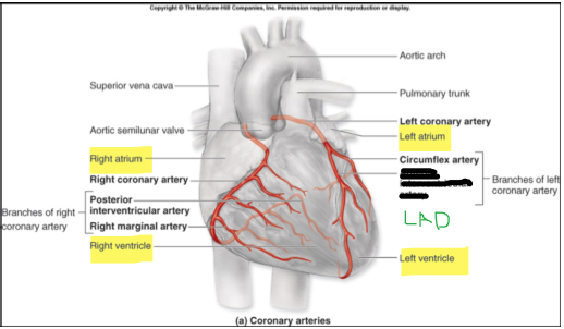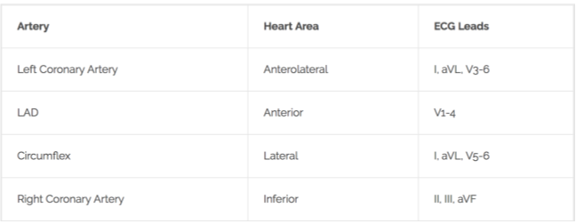 summary table of artery, heart area it supplies and ECG leads