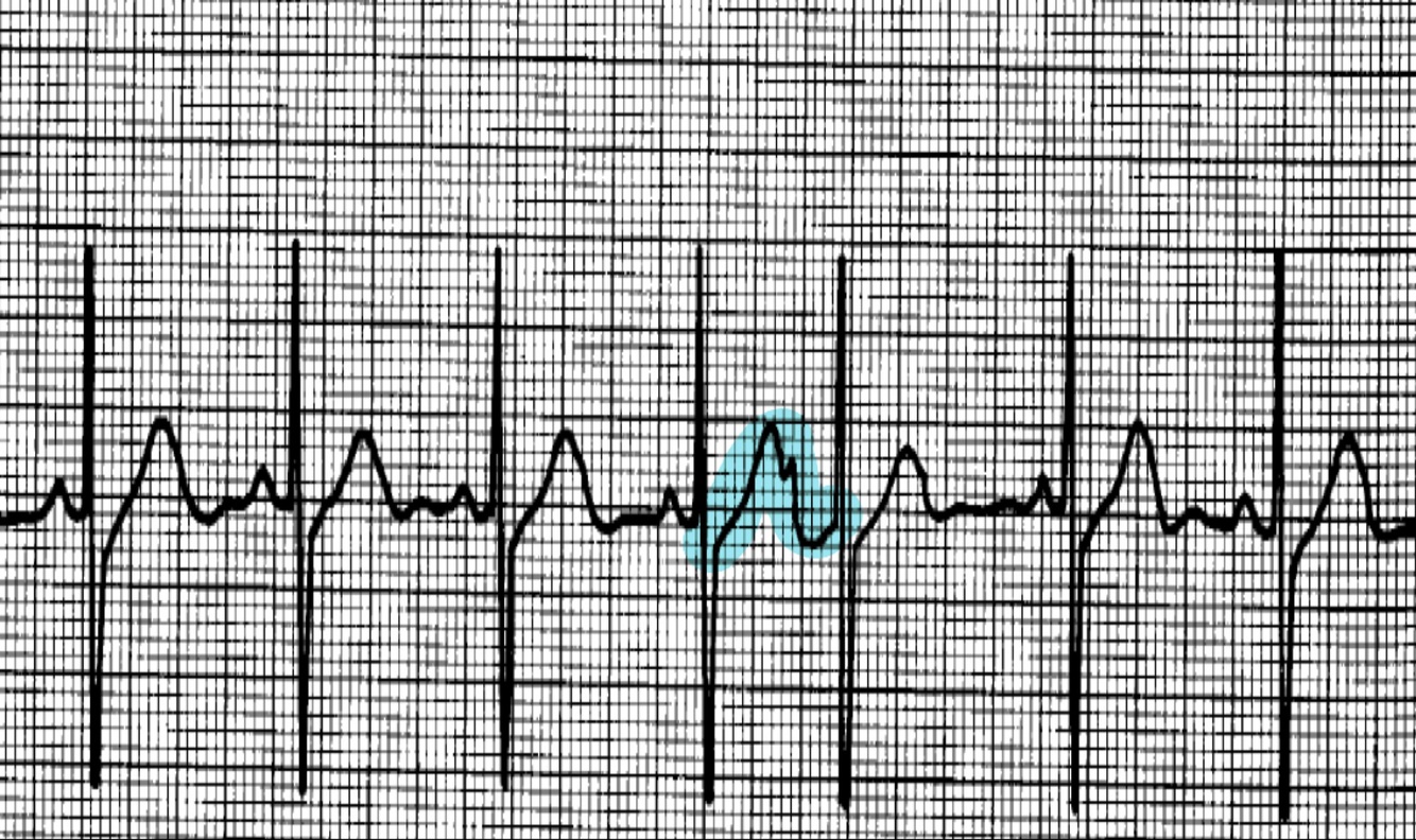P waves: one for every QRS, but absent at premature ventricular contraction (PVC)