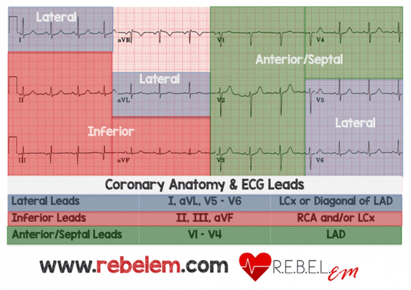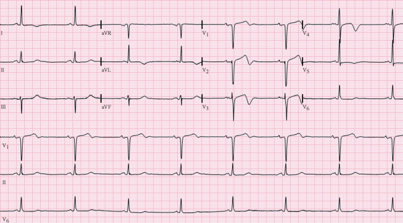 ST depression and TWI in V1-3 and inferior leads (II, III & AvF)