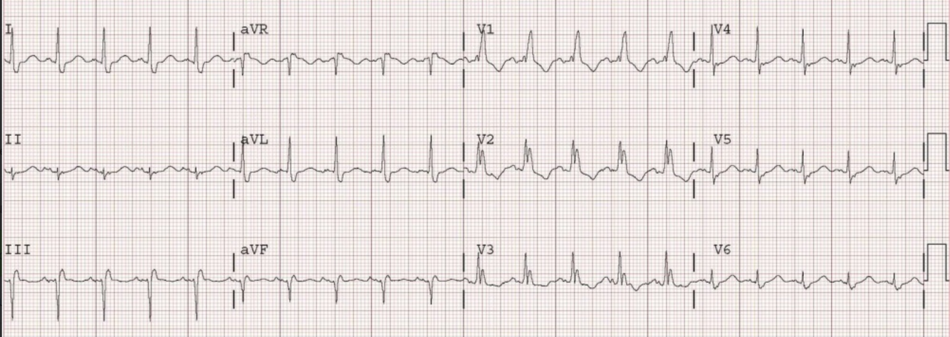 The ECG shows both right bundle branch block and left axis deviation indicating bifascicular block