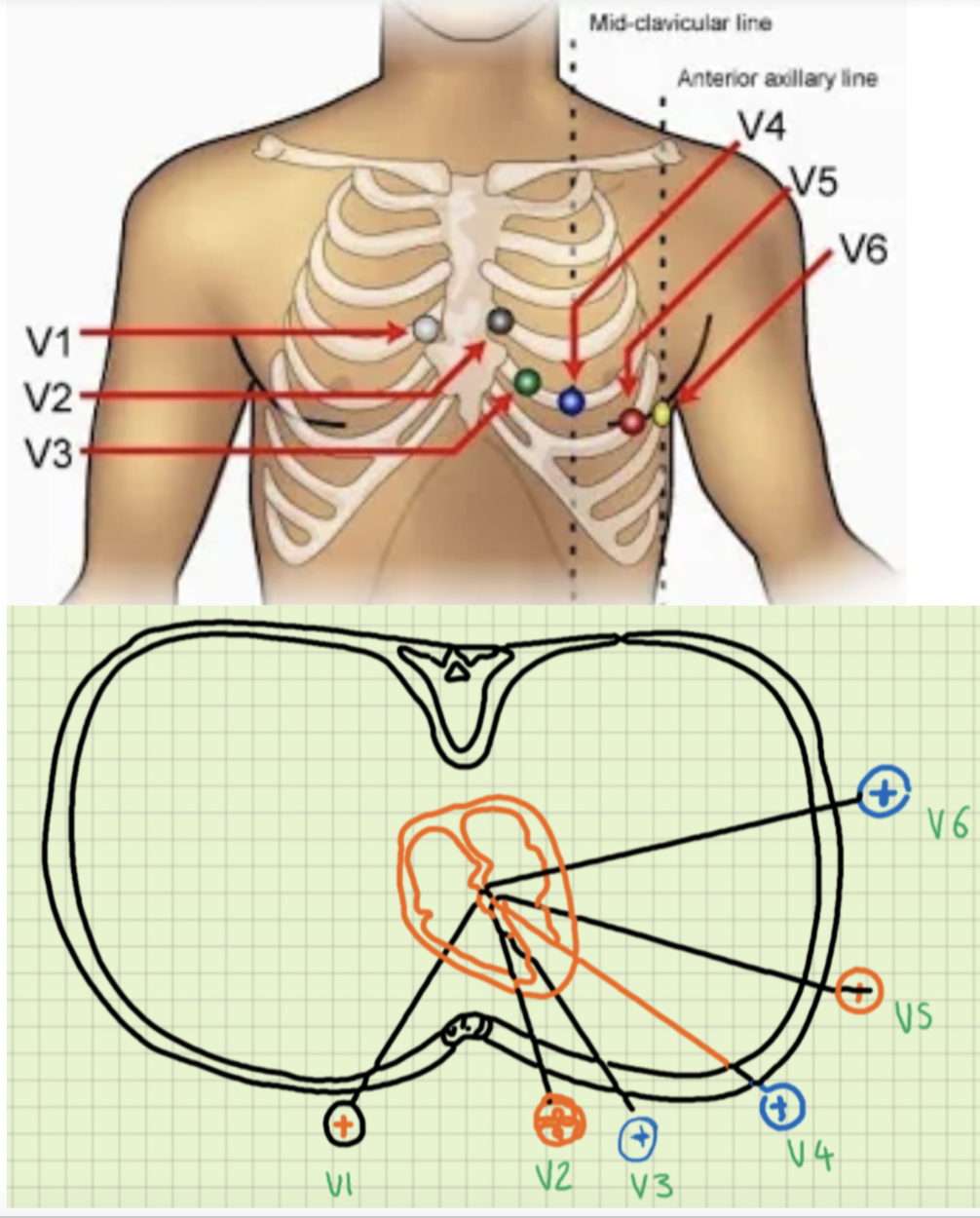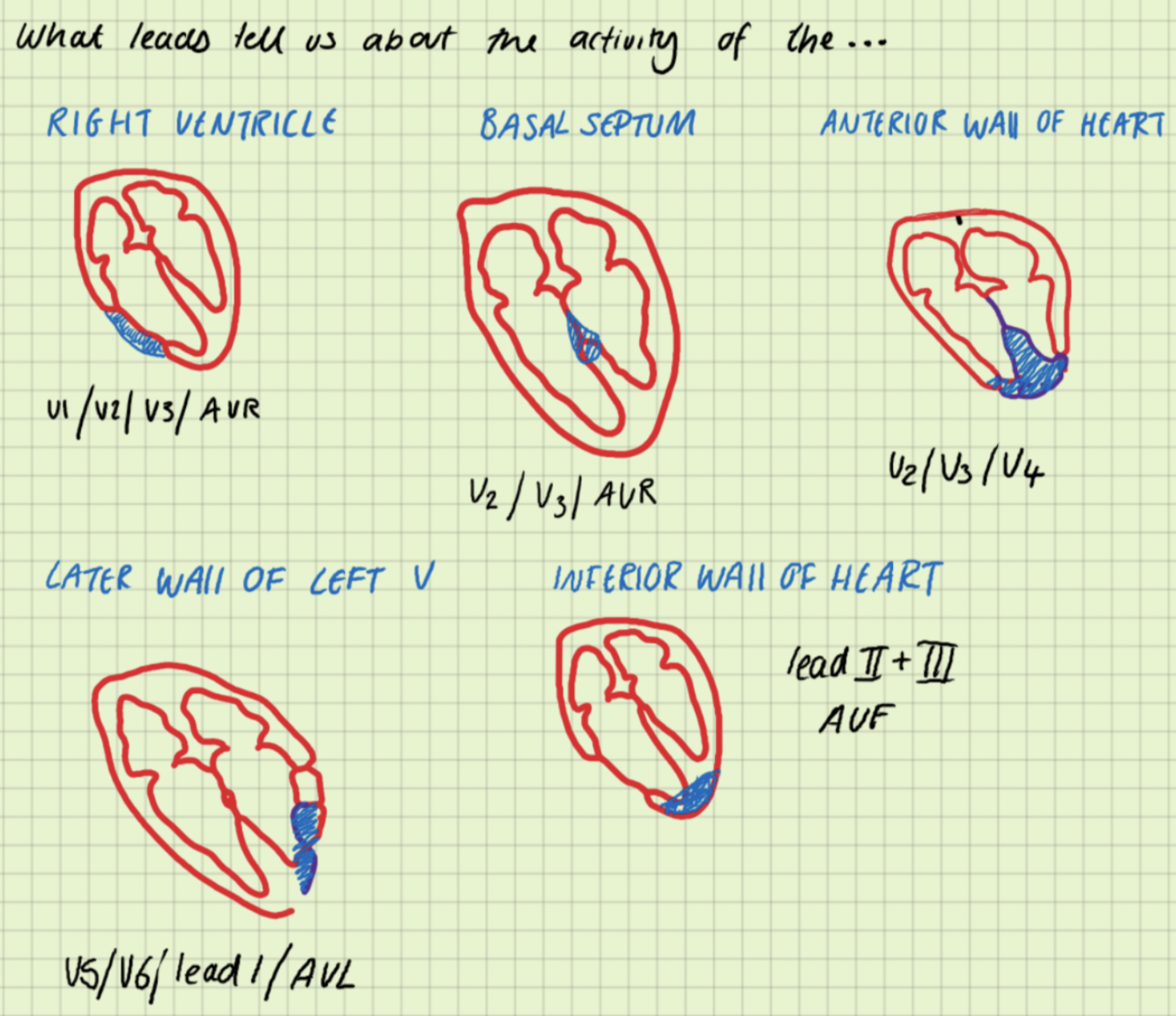 12 universally standardised leads look at electrical activity from different angles. Standardised so that abnormalities are not due to lead placement