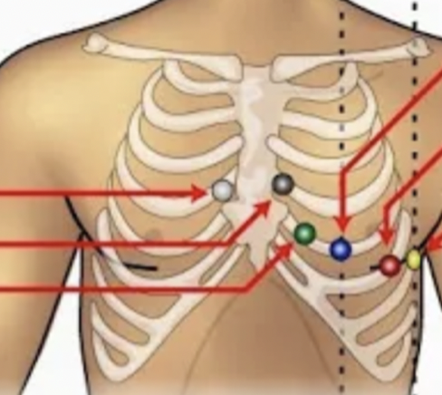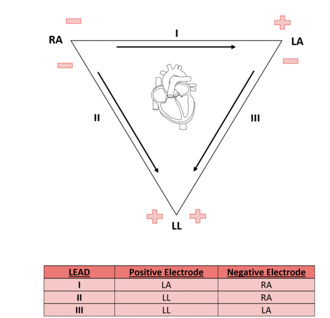 The limb electrodes, I, II and III form Einthoven’s Equilateral Triangle at the right arm (RA), left arm (LA) and left leg (LL).