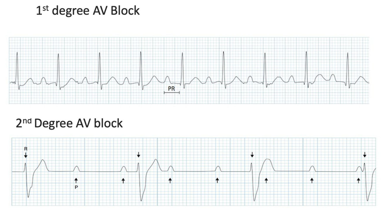 2nd: more than 1 P wave to a QRS complex. Initial P waves cause nothing to happen- only the 2nd or 3rd P wave will stimulate the AVN (mobid type 1). In periods of intense exercise, AVN conducts slower and slower- wenckebach phenomenon