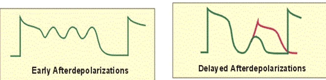 Early - occur during late phase 2 or 3. Can lead to a salvo of several rapid a.potentials or a prolonged series of action potentials e.g. VT. This form of triggered activity is more likely to occur when the action potential duration is increased.