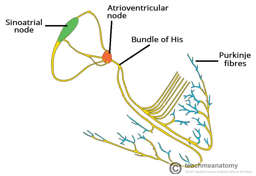 SA node => AV node => Bundle of His (IV Septum) => Bundle Branches => Purkinje Fibres