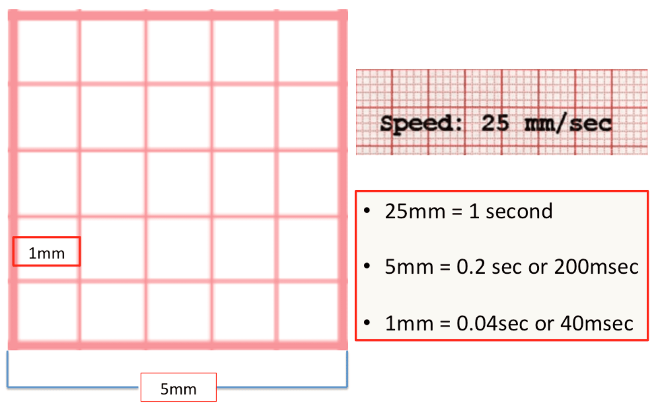 Heavier lines forming larger boxes (thatinclude five small boxes) hence represent 0.20 sec (200 ms) intervals and are therefore 5mm or 0.5 in length