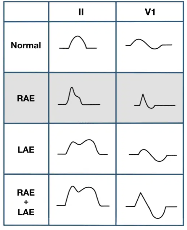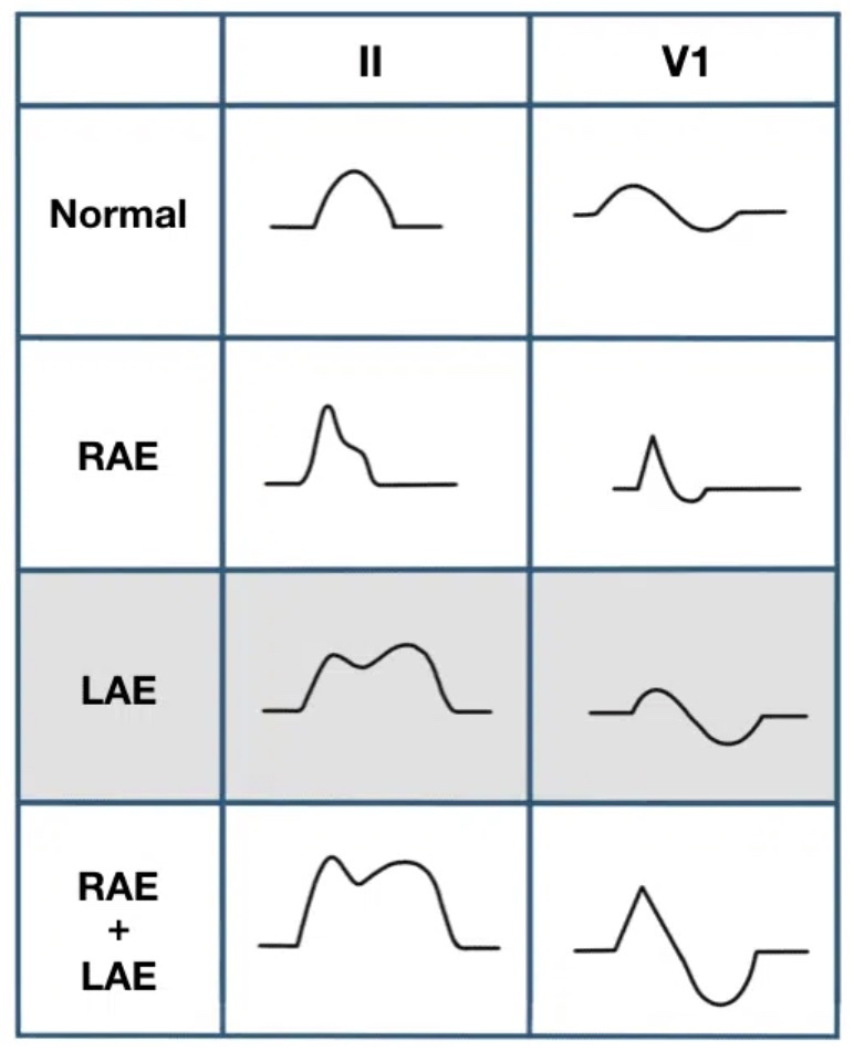 Biphasic p wave in II (second hump) and a deep negative deflection in V1