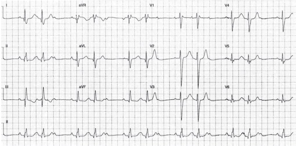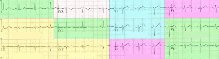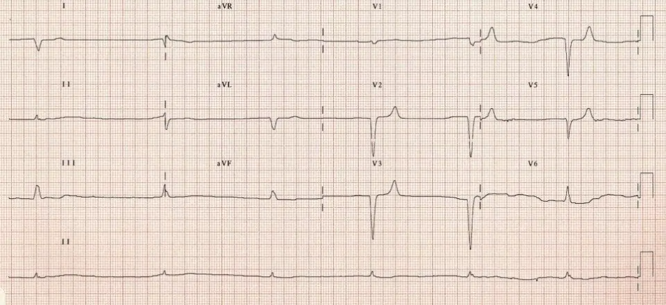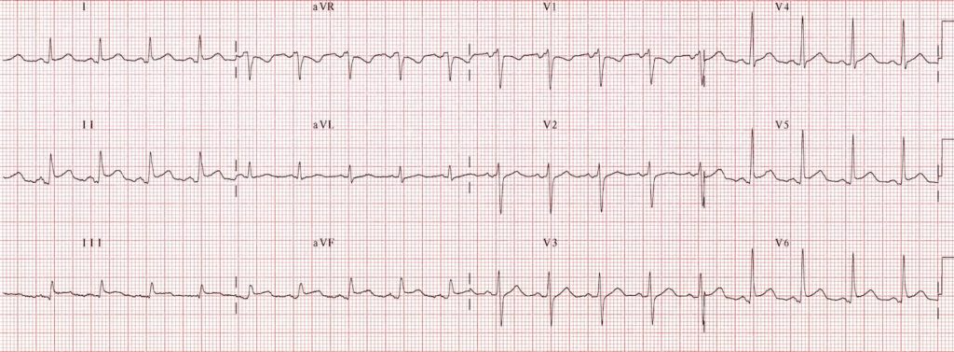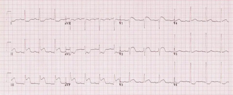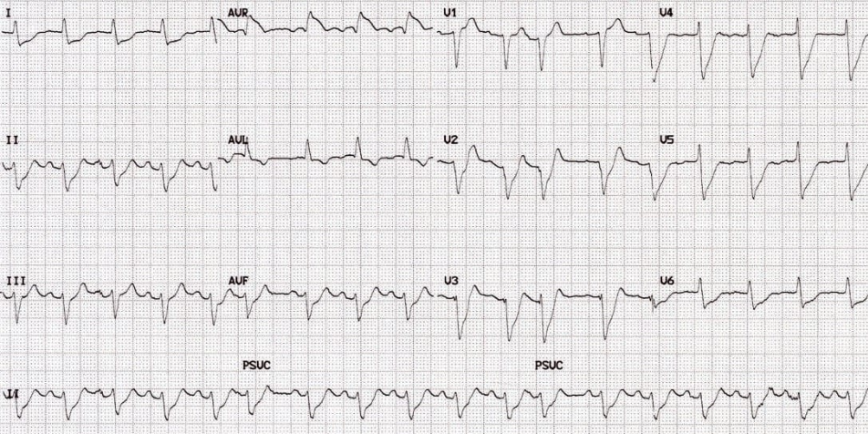 ST depression in V2-6 and I,II and aVF