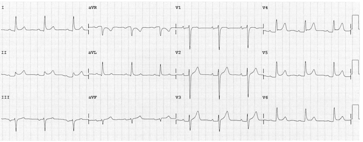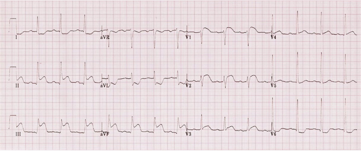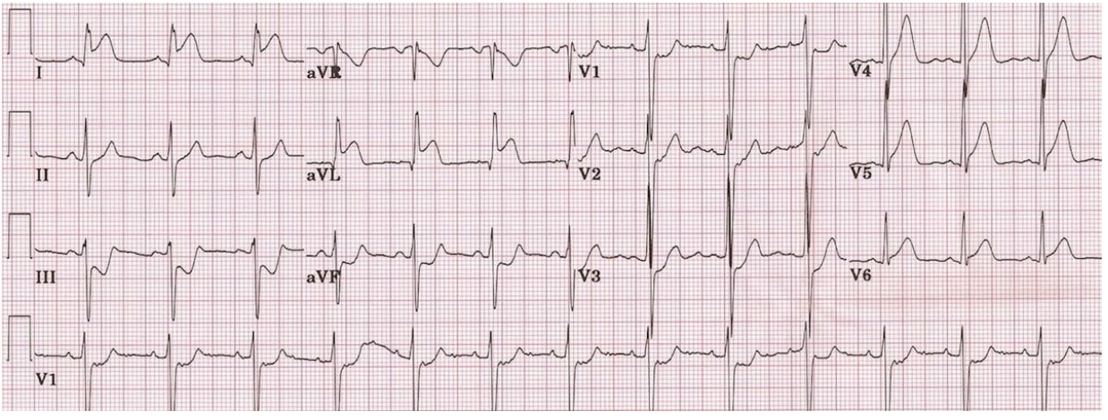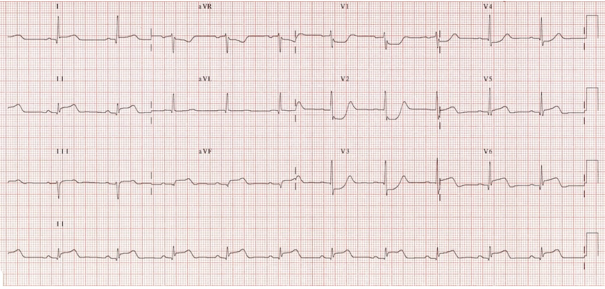 Widespread concave ST elevation and PR depression is present throughout the precordial (V2-6) and limb leads (I, II, aVL, aVF).